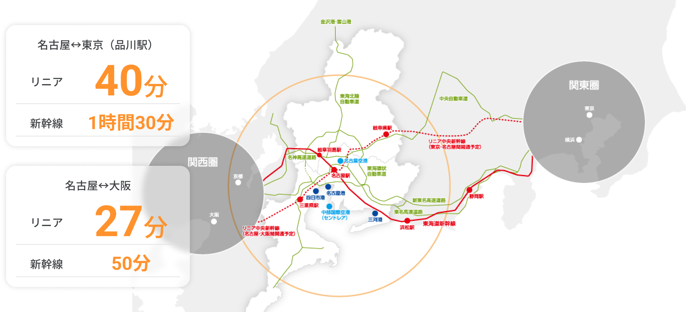 グレーター・ナゴヤは日本の真ん中に位置し、関東圏、関西圏へのアクセスが容易です。